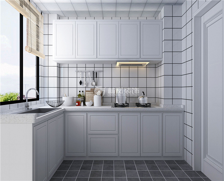 廚房裝修,櫥柜考慮的是白色的門板,配合墻面白墻磚,立體感很強(qiáng)??臻g感變大。