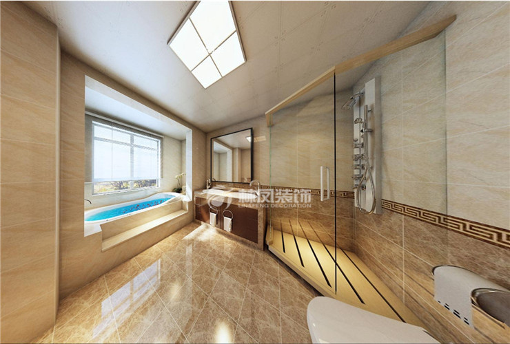 碧桂園太陽城360平3居室中式風(fēng)格林鳳裝飾的衛(wèi)生間采用AB版仿理石紋理拋釉磚,加上腰線的點(diǎn)綴,為整個(gè)空間增加了檔次,搭配砌筑式浴缸,以及實(shí)木的木質(zhì)手盆,令空間更有層次效果。
