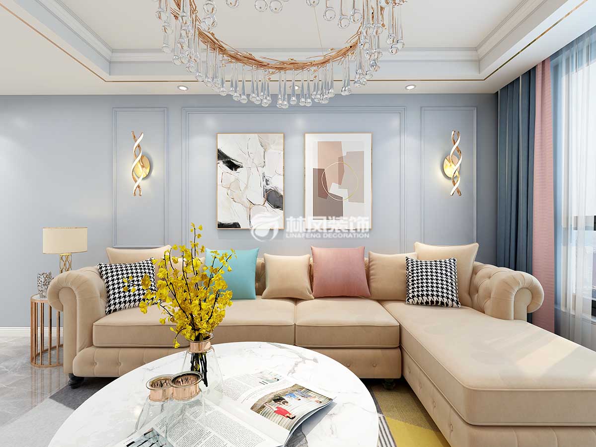碧桂園繁華里99平三室兩廳輕奢風(fēng)格林鳳裝飾的客廳擺放的三人位布藝沙發(fā)灰色的墻面,窗簾的顏色,整體的色彩和材質(zhì)的運(yùn)用形成一個(gè)呼應(yīng),整體不失美感和視覺上的舒適度。