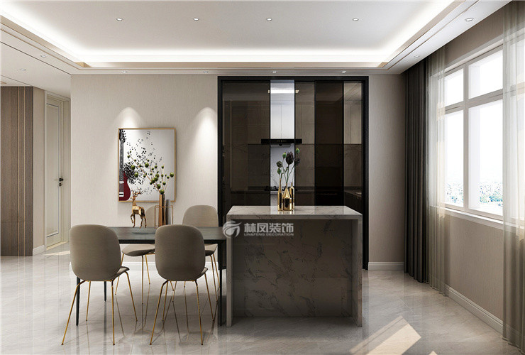 遠(yuǎn)洋大河宸章155平三室兩廳現(xiàn)代港式風(fēng)格林鳳裝飾的餐廳色彩線條簡(jiǎn)單的餐桌椅,顯得干練簡(jiǎn)潔,與島臺(tái)結(jié)合在一起,非常實(shí)用,綠植的裝飾添加了生氣。
