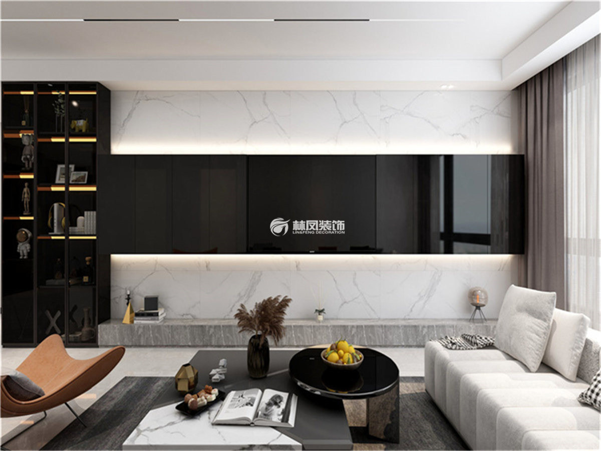 電視背景兩側(cè)采用了高光材質(zhì)定制柜體,背景墻底部巖板滿鋪看上去更簡潔大氣,整體,滿足了審美需求的同時也起到了材質(zhì)與色彩的視覺反差碰撞。