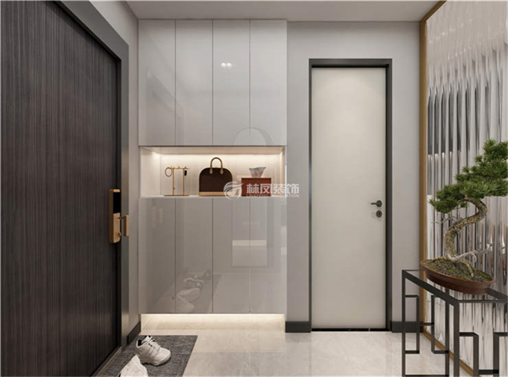 白色高光板鞋柜顯得整潔有藝術(shù)感,金色玻璃框內(nèi)超白長虹玻璃透光不透影,迎客松盆景點綴了色彩的同時也帶來了一絲意境。