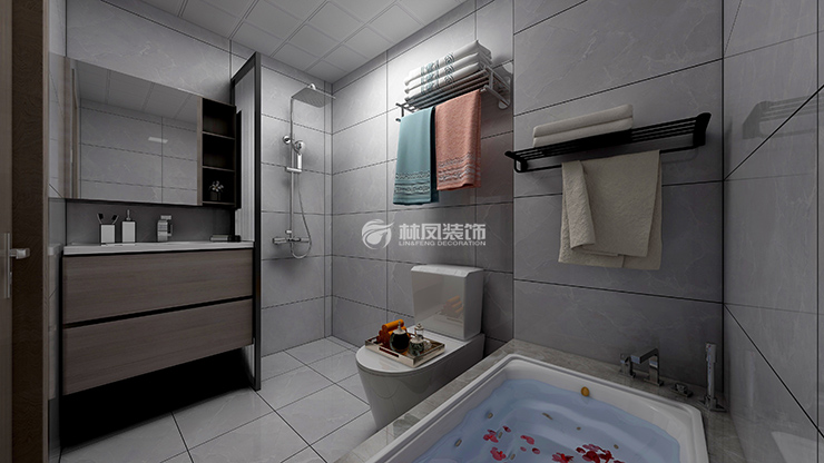 主衛(wèi)瓷磚為通體版,提升空間視覺效果。跳色的浴室柜打破固有的灰色體系。坐便的空間比較狹小,放置浴屏?xí)箍臻g受限,采用單扇玻璃既可以擋水,也可以將空間提升到最大限度。
