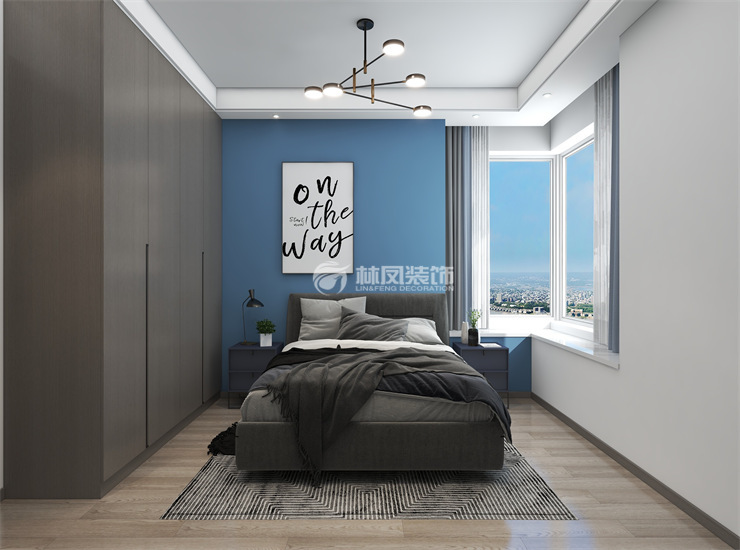 臥室說(shuō)明: :灰色與藍(lán)色的撞色設(shè)計(jì),使空間顯得簡(jiǎn)潔明了,和衣柜顏色相呼應(yīng),更具時(shí)尚感