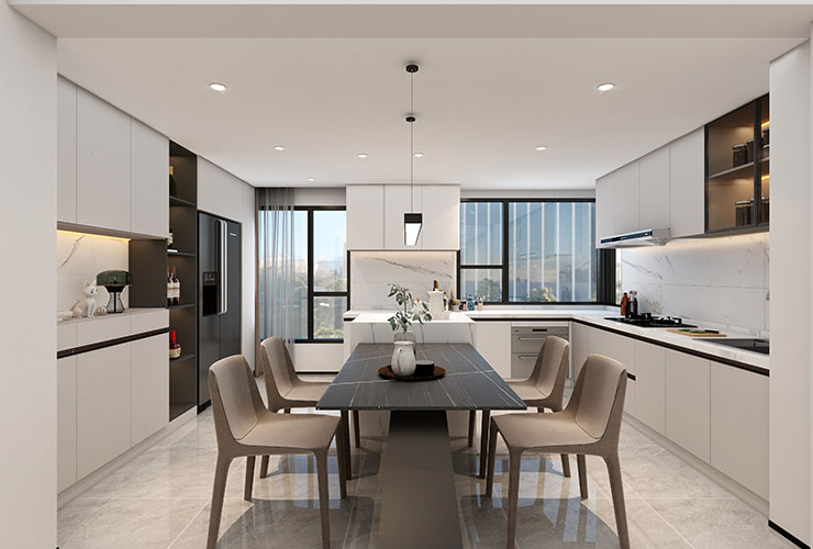 餐廳說(shuō)明:餐廳的島臺(tái)是整個(gè)餐區(qū)的點(diǎn)睛之筆,撐起整個(gè)餐廚空間的顏值,兼具實(shí)用功能。