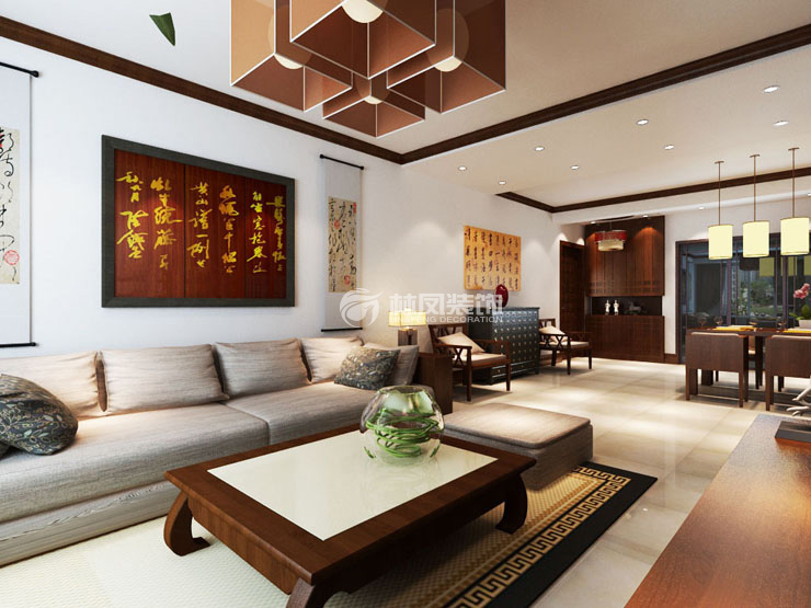 餐廳吊棚與客廳一樣,胡桃木圈邊,餐廳不做造型墻,餐桌墻面用成品的裝飾品裝飾。